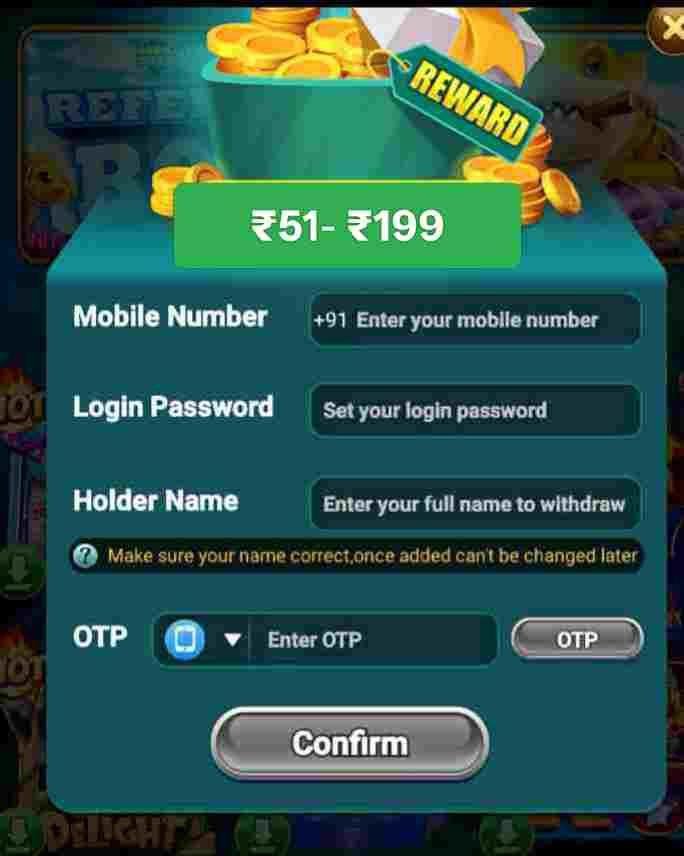 इसके बाद, नंबर डालें और धारक का नाम डालें, फिर OTP आइकन पर क्लिक करें। जैसे ही आप OTP आइकन पर क्लिक करेंगे, आपके मोबाइल नंबर पर एक चार अंकों का OTP आएगा, उसे डालें और वेरिफाई करें, आपको ₹8 to ₹199 का बोनस मिलेगा, जिसका उपयोग is single application ke andar 60+ plus game hai इनमें से आप अपना मन पसंदीदा गेम खेल सकते हैं आप गेम खेल सकेंगे और रोजाना 5000 से ₹10000 तक कमा सकते हैं,।